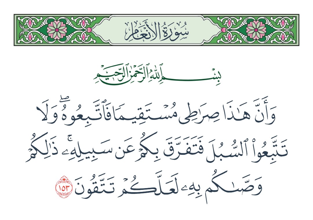 وأن هذا صراطي مستقيما فاتبعوه ولا تتبعوا السبل فتفرق بكم عن سبيله ذلكم وصاكم به لعلكم تتقون [الأنعام : 153]