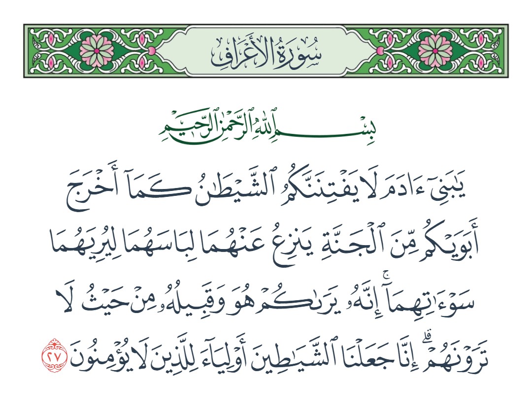 يا بني آدم لا يفتننكم الشيطان كما أخرج أبويكم من الجنة ينزع عنهما لباسهما ليريهما سوءاتهما إنه يراكم هو وقبيله من حيث لا ترونهم إنا جعلنا الشياطين أولياء للذين لا يؤمنون [الأعراف : 27]