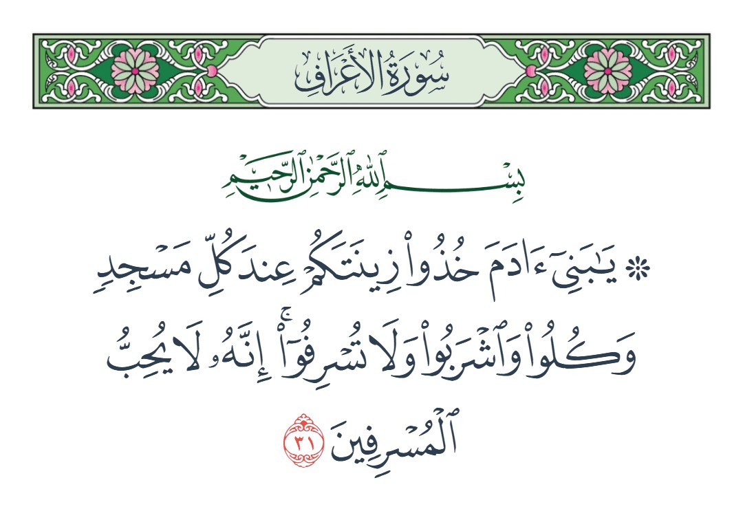 يا بني آدم خذوا زينتكم عند كل مسجد وكلوا واشربوا ولا تسرفوا إنه لا يحب المسرفين [الأعراف : 31]