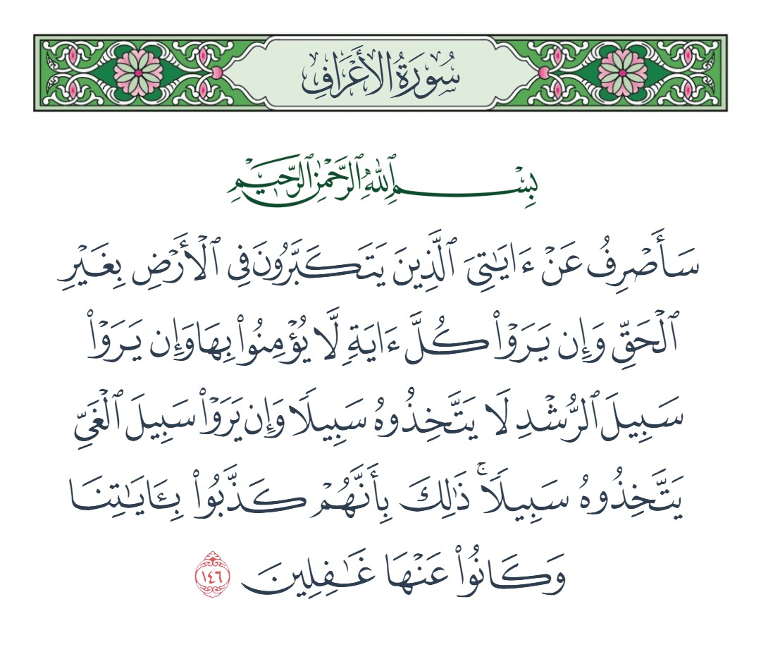 سأصرف عن آياتي الذين يتكبرون في الأرض بغير الحق وإن يروا كل آية لا يؤمنوا بها وإن يروا سبيل الرشد لا يتخذوه سبيلا وإن يروا سبيل الغي يتخذوه سبيلا ذلك بأنهم كذبوا بآياتنا وكانوا عنها غافلين [الأعراف : 146]