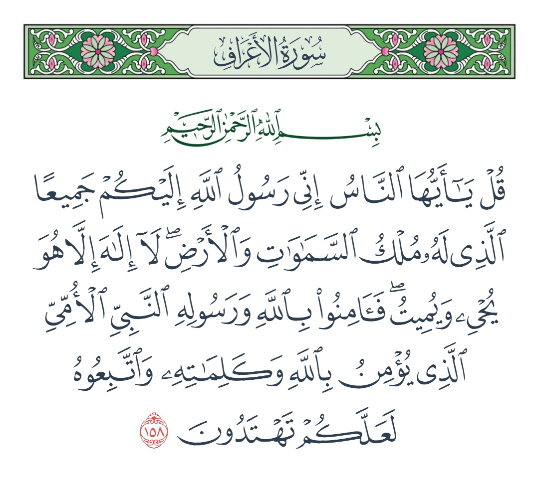 قل يا أيها الناس إني رسول الله إليكم جميعا الذي له ملك السماوات والأرض لا إله إلا هو يحيي ويميت فآمنوا بالله ورسوله النبي الأمي الذي يؤمن بالله وكلماته واتبعوه لعلكم تهتدون [الأعراف : 158]