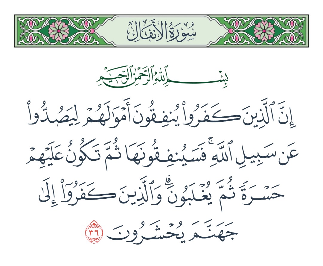 إن الذين كفروا ينفقون أموالهم ليصدوا عن سبيل الله فسينفقونها ثم تكون عليهم حسرة ثم يغلبون والذين كفروا إلى جهنم يحشرون [الأنفال : 36]