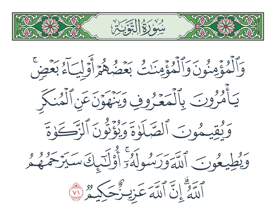 والمؤمنون والمؤمنات بعضهم أولياء بعض يأمرون بالمعروف وينهون عن المنكر ويقيمون الصلاة ويؤتون الزكاة ويطيعون الله ورسوله أولئك سيرحمهم الله إن الله عزيز حكيم [التوبة : 71]