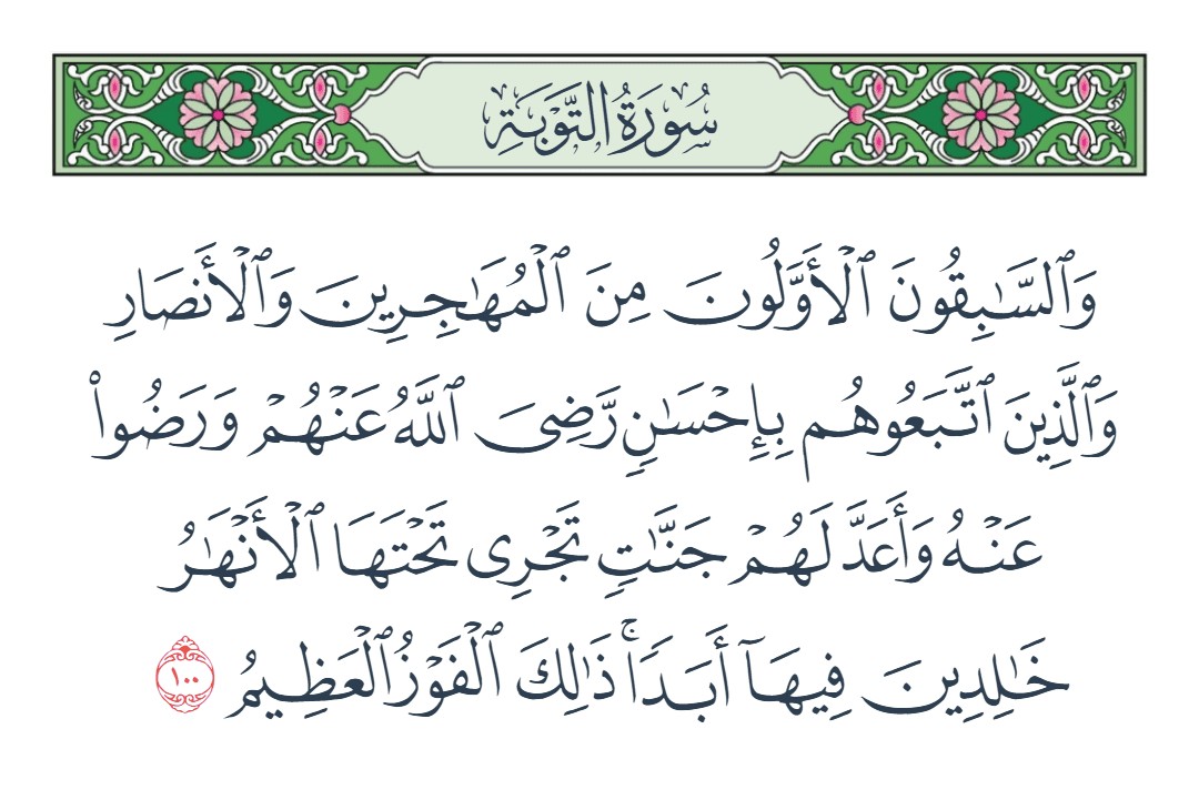 والسابقون الأولون من المهاجرين والأنصار والذين اتبعوهم بإحسان رضي الله عنهم ورضوا عنه وأعد لهم جنات تجري تحتها الأنهار خالدين فيها أبدا ذلك الفوز العظيم [التوبة : 100]