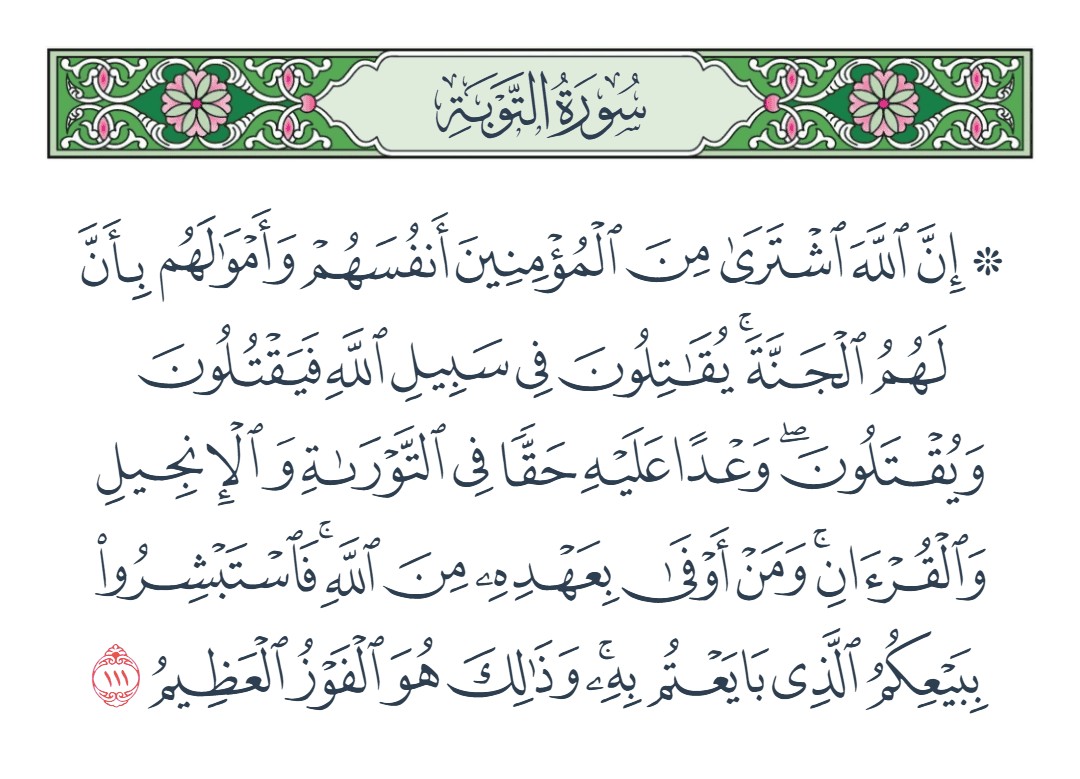 إن الله اشترى من المؤمنين أنفسهم وأموالهم بأن لهم الجنة يقاتلون في سبيل الله فيقتلون ويقتلون وعدا عليه حقا في التوراة والإنجيل والقرآن ومن أوفى بعهده من الله فاستبشروا ببيعكم الذي بايعتم به وذلك هو الفوز العظيم [التوبة : 111]