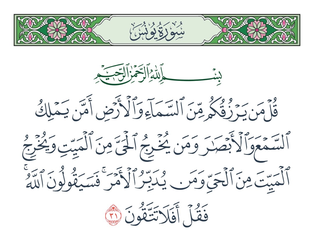 قل من يرزقكم من السماء والأرض أمن يملك السمع والأبصار ومن يخرج الحي من الميت ويخرج الميت من الحي ومن يدبر الأمر فسيقولون الله فقل أفلا تتقون [يونس : 31]