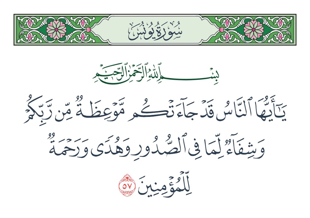 يا أيها الناس قد جاءتكم موعظة من ربكم وشفاء لما في الصدور وهدى ورحمة للمؤمنين [يونس : 57]