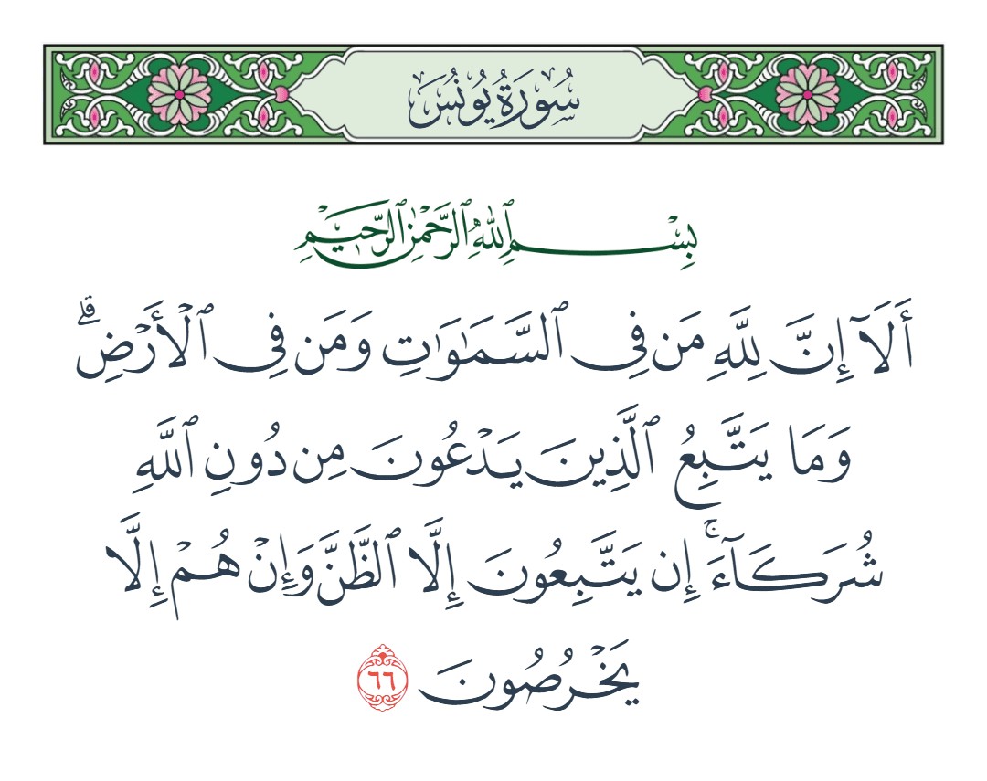 ألا إن لله من في السماوات ومن في الأرض وما يتبع الذين يدعون من دون الله شركاء إن يتبعون إلا الظن وإن هم إلا يخرصون [يونس : 66]