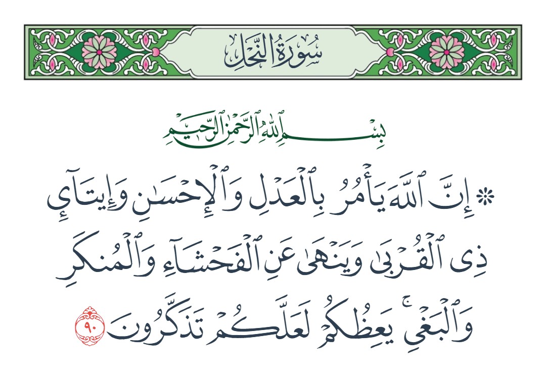 إن الله يأمر بالعدل والإحسان وإيتاء ذي القربى وينهى عن الفحشاء والمنكر والبغي يعظكم لعلكم تذكرون [النحل : 90]