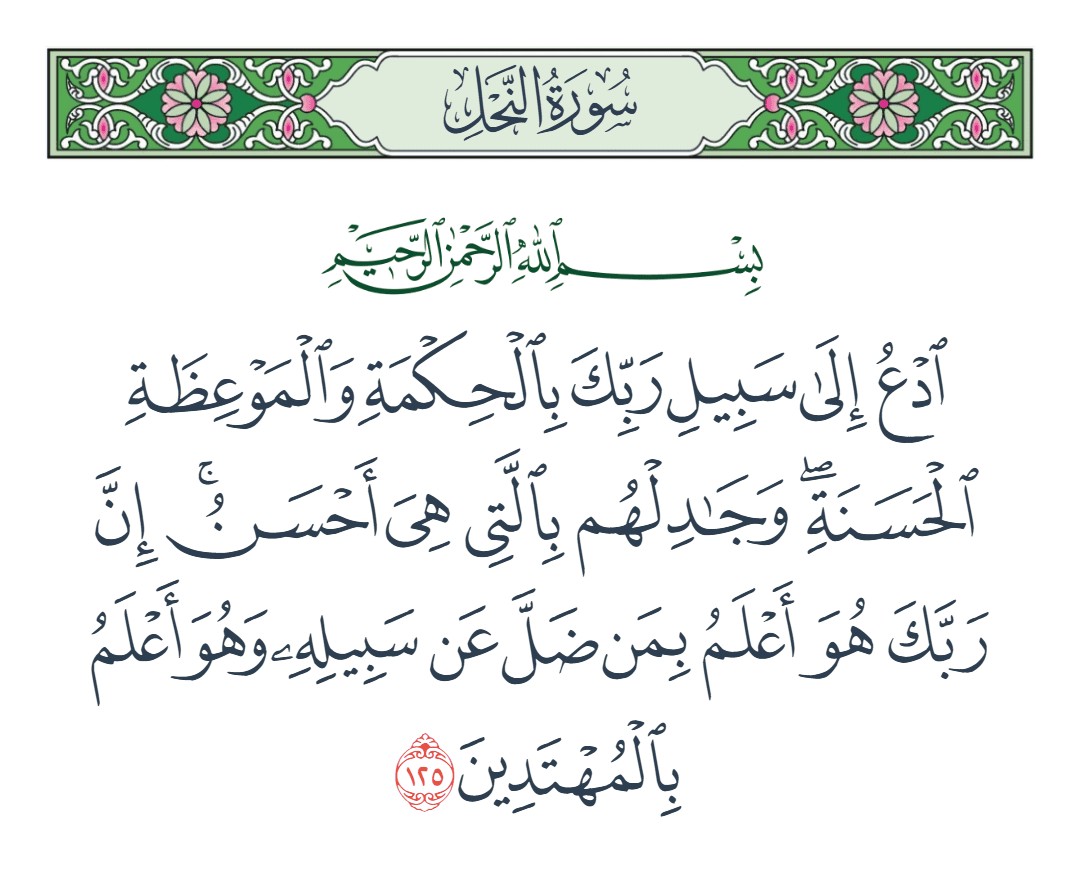 ادع إلى سبيل ربك بالحكمة والموعظة الحسنة وجادلهم بالتي هي أحسن إن ربك هو أعلم بمن ضل عن سبيله وهو أعلم بالمهتدين [النحل : 125]