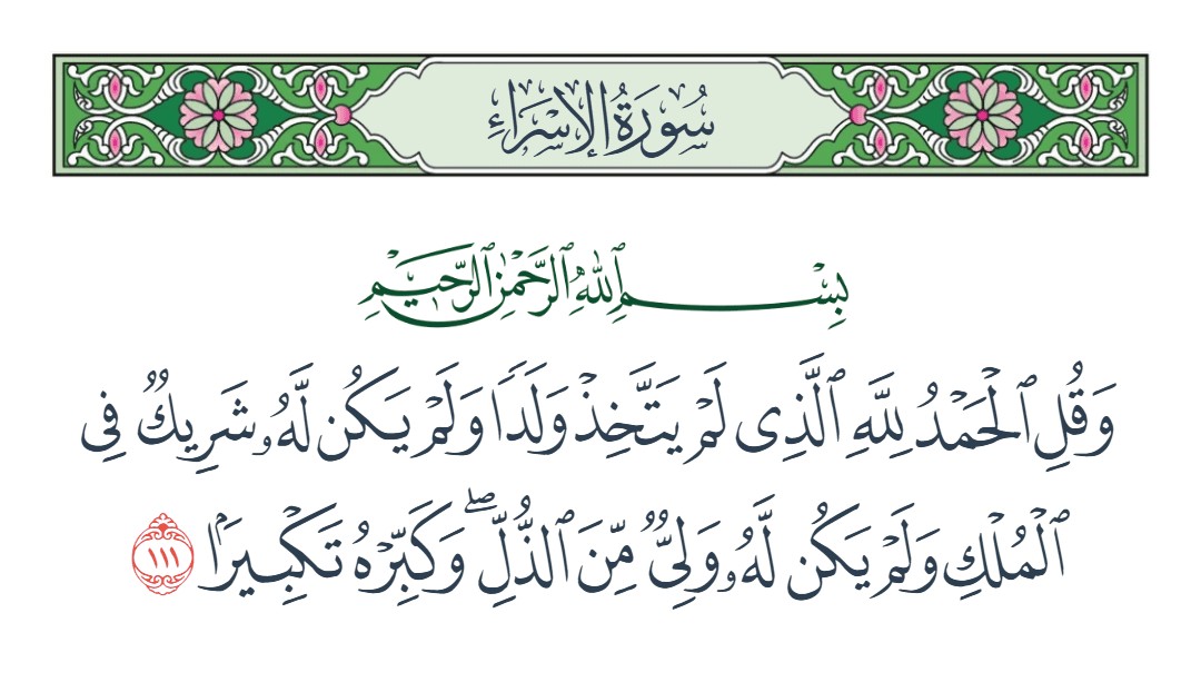 وقل الحمد لله الذي لم يتخذ ولدا ولم يكن له شريك في الملك ولم يكن له ولي من الذل وكبره تكبيرا [الإسراء : 111]