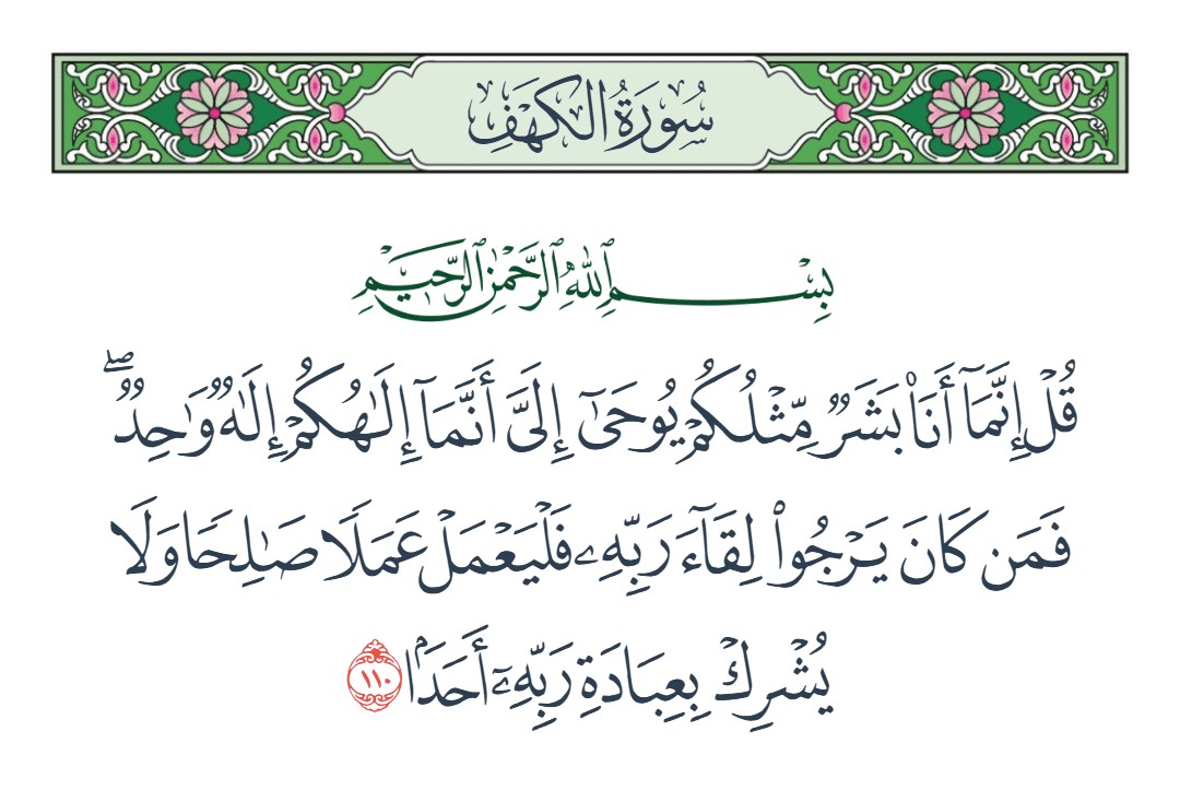 قل إنما أنا بشر مثلكم يوحى إلي أنما إلهكم إله واحد فمن كان يرجو لقاء ربه فليعمل عملا صالحا ولا يشرك بعبادة ربه أحدا [الكهف : 110]