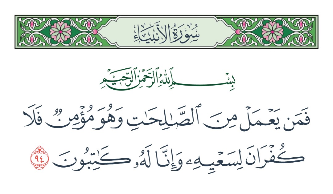 فمن يعمل من الصالحات وهو مؤمن فلا كفران لسعيه وإنا له كاتبون [الأنبياء : 94]