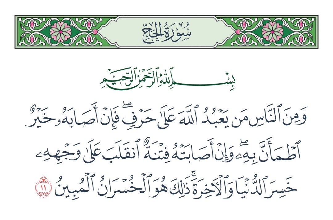 ومن الناس من يعبد الله على حرف فإن أصابه خير اطمأن به وإن أصابته فتنة انقلب على وجهه خسر الدنيا والآخرة ذلك هو الخسران المبين [الحج : 11]