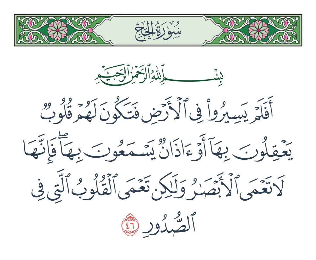 أفلم يسيروا في الأرض فتكون لهم قلوب يعقلون بها أو آذان يسمعون بها فإنها لا تعمى الأبصار ولكن تعمى القلوب التي في الصدور [الحج : 46]