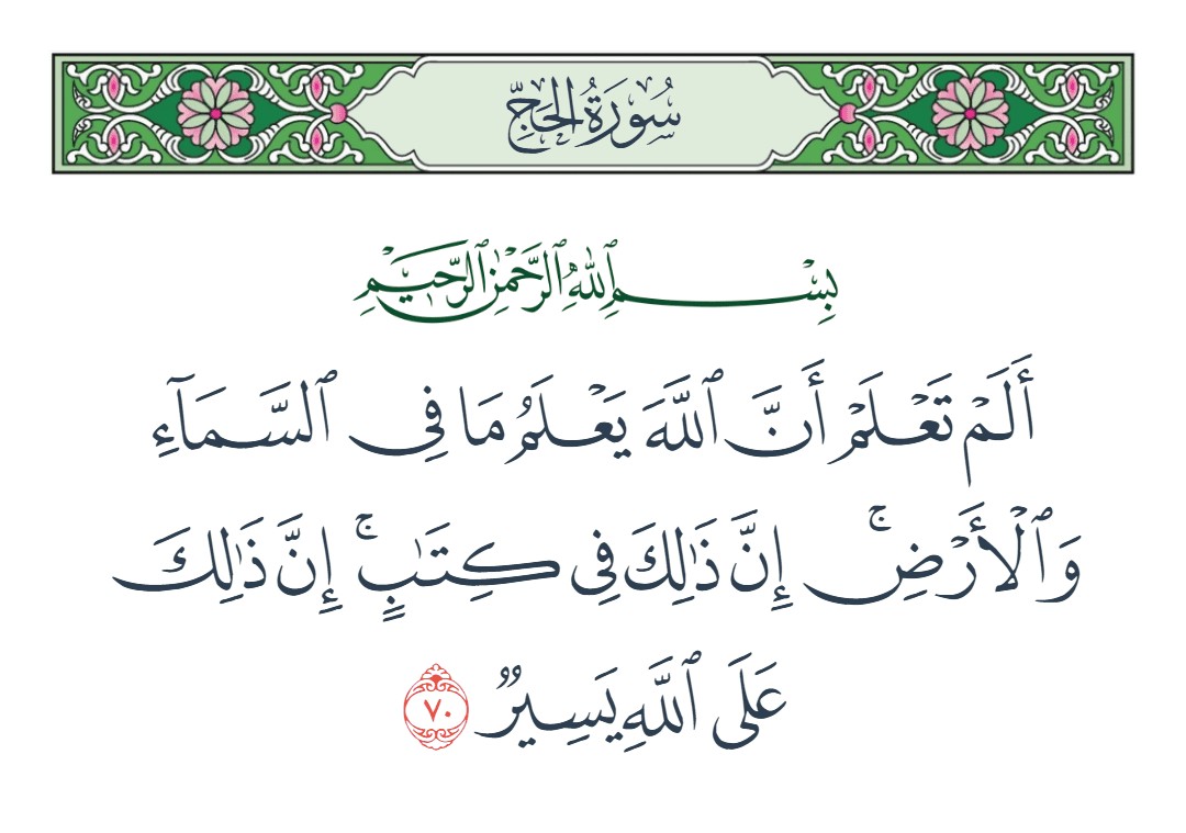 إن ذلك على الله يسير لمشاهدة الصورة بحجمها الأصلي اضغط هنا تنزيل الصورة : ملف نصّي إن ذلك على الله يسير بسم الله الرحمن الرحيم ألم تعلم أن الله يعلم ما في السماء والأرض إن ذلك في كتاب إن ذلك على الله يسير [الحج : 70] نسخ النص بالضغط على هذا الزر .. سيتم نسخ النص إلى الحافظة .. حيث يمكنك مشاركته من خلال استعمال الأمر ـ " لصق " ـ سلسلة بطاقات بلغوا عني ولو آية شارك :