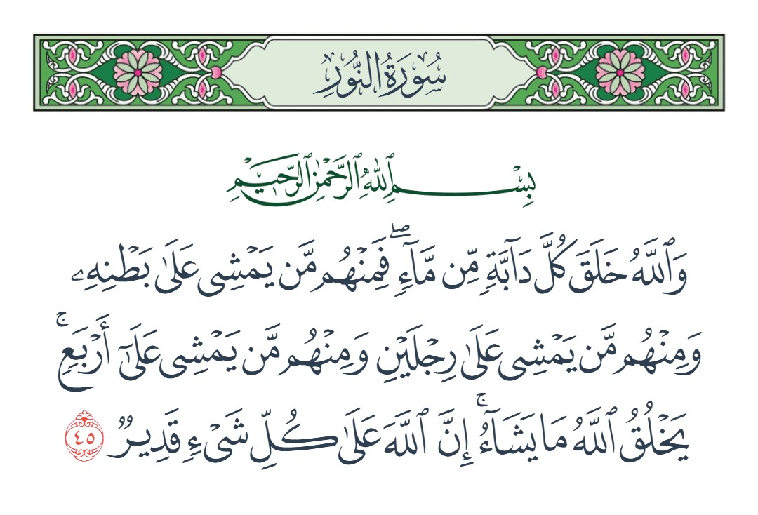 والله خلق كل دابة من ماء فمنهم من يمشي على بطنه ومنهم من يمشي على رجلين ومنهم من يمشي على أربع يخلق الله ما يشاء إن الله على كل شيء قدير [النور : 45]