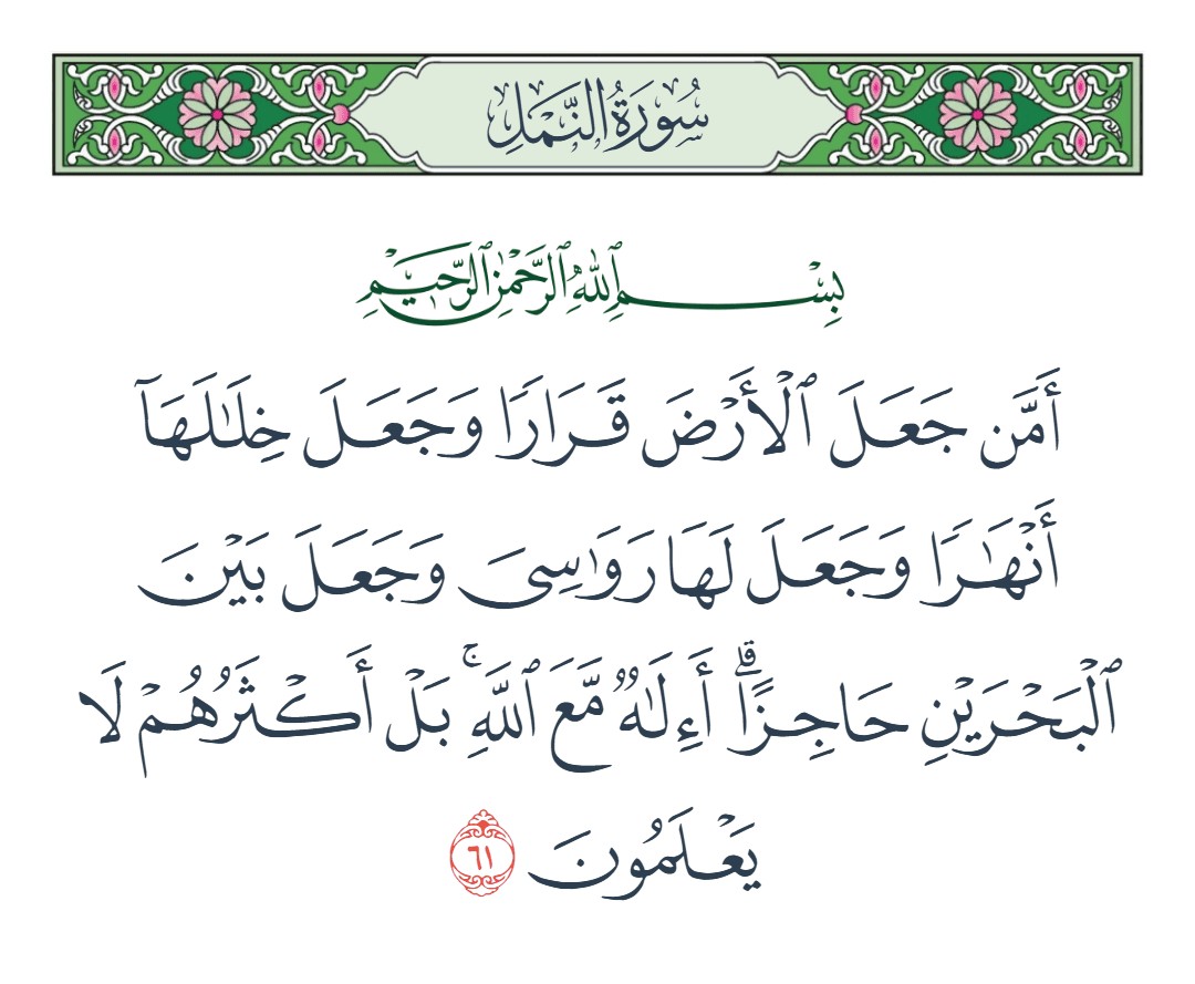 أمن جعل الأرض قرارا وجعل خلالها أنهارا وجعل لها رواسي وجعل بين البحرين حاجزا أإله مع الله بل أكثرهم لا يعلمون [النمل : 61]