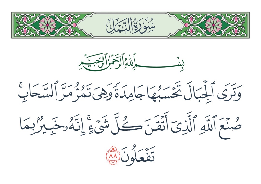 وترى الجبال تحسبها جامدة وهي تمر مر السحاب صنع الله الذي أتقن كل شيء إنه خبير بما تفعلون [النمل : 88]
