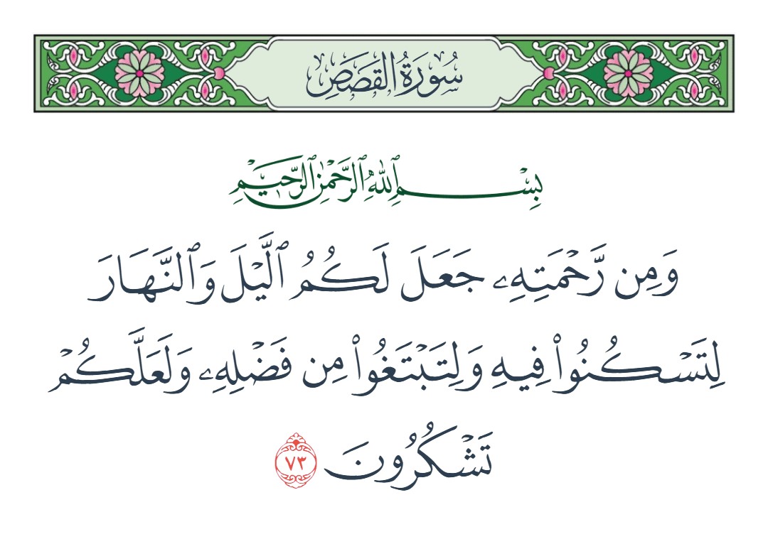 ومن رحمته جعل لكم الليل والنهار لتسكنوا فيه ولتبتغوا من فضله ولعلكم تشكرون [القصص : 73]