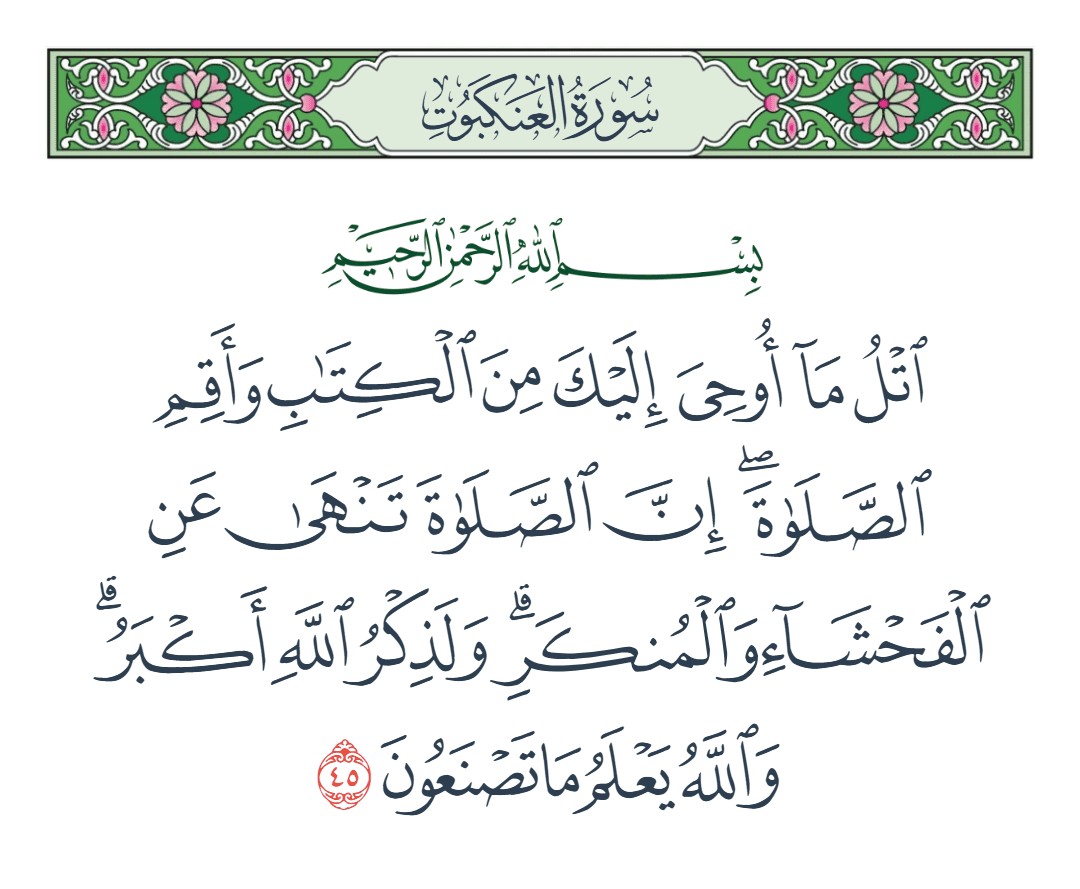 اتل ما أوحي إليك من الكتاب وأقم الصلاة إن الصلاة تنهى عن الفحشاء والمنكر ولذكر الله أكبر والله يعلم ما تصنعون [العنكبوت : 45]
