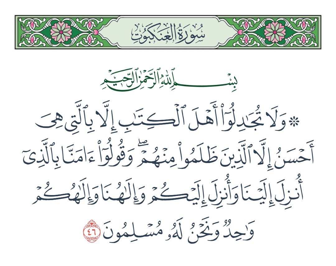 ولا تجادلوا أهل الكتاب إلا بالتي هي أحسن إلا الذين ظلموا منهم وقولوا آمنا بالذي أنزل إلينا وأنزل إليكم وإلهنا وإلهكم واحد ونحن له مسلمون [العنكبوت : 46]