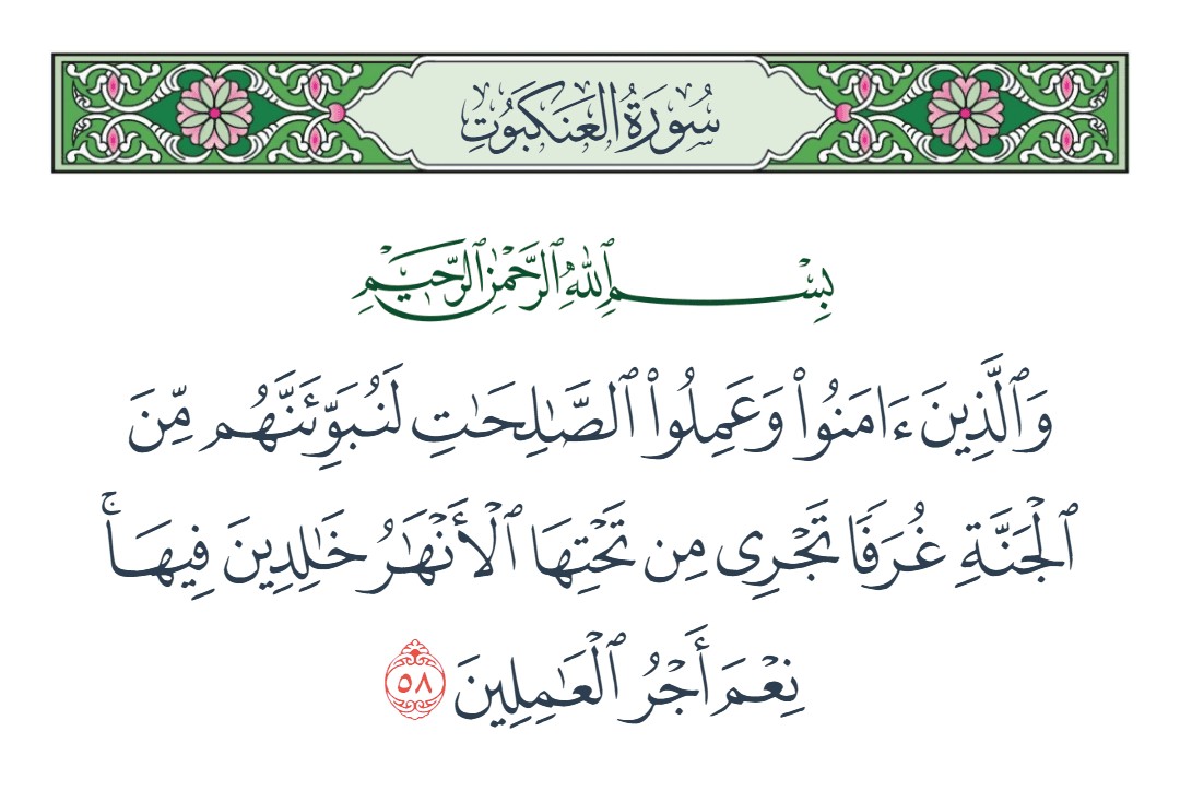 والذين آمنوا وعملوا الصالحات لنبوئنهم من الجنة غرفا تجري من تحتها الأنهار خالدين فيها نعم أجر العاملين [العنكبوت : 58]