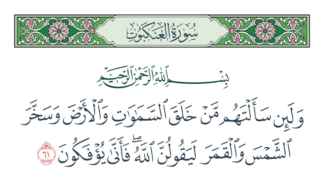 ولئن سألتهم من خلق السماوات والأرض وسخر الشمس والقمر ليقولن الله فأنى يؤفكون [العنكبوت : 61]
