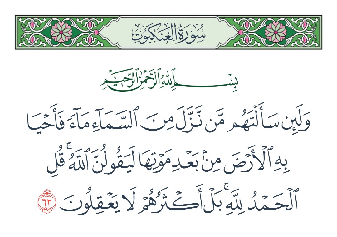 ولئن سألتهم من نزل من السماء ماء فأحيا به الأرض من بعد موتها ليقولن الله قل الحمد لله بل أكثرهم لا يعقلون [العنكبوت : 63]