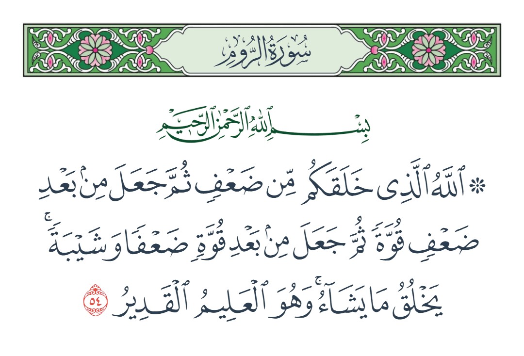 الله الذي خلقكم من ضعف ثم جعل من بعد ضعف قوة ثم جعل من بعد قوة ضعفا وشيبة يخلق ما يشاء وهو العليم القدير [الروم : 54]