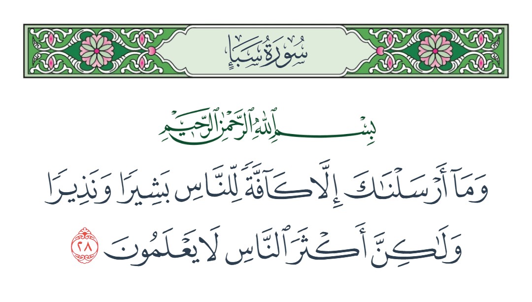 وما أرسلناك إلا كافة للناس بشيرا ونذيرا ولكن أكثر الناس لا يعلمون [سبأ : 28]