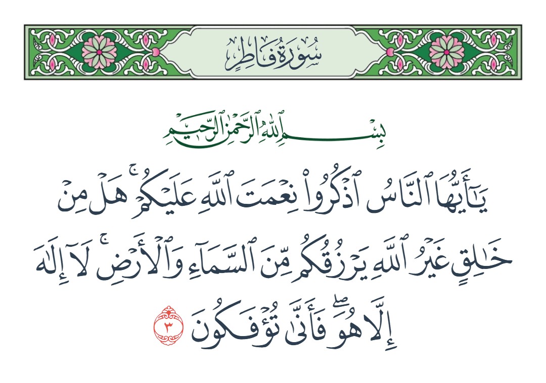 يا أيها الناس اذكروا نعمت الله عليكم هل من خالق غير الله يرزقكم من السماء والأرض لا إله إلا هو فأنى تؤفكون [فاطر : 3]