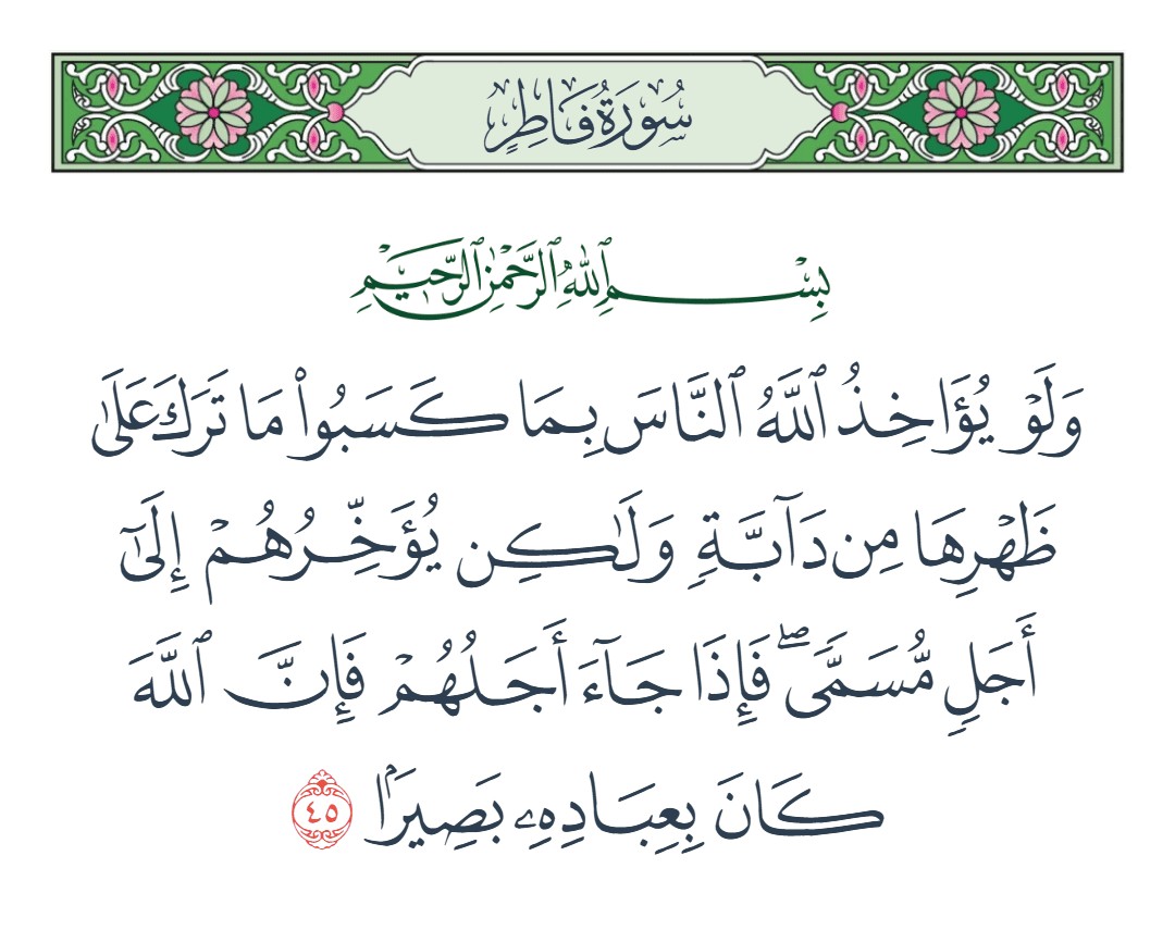 ولو يؤاخذ الله الناس بما كسبوا ما ترك على ظهرها من دابة ولكن يؤخرهم إلى أجل مسمى فإذا جاء أجلهم فإن الله كان بعباده بصيرا [فاطر : 45]