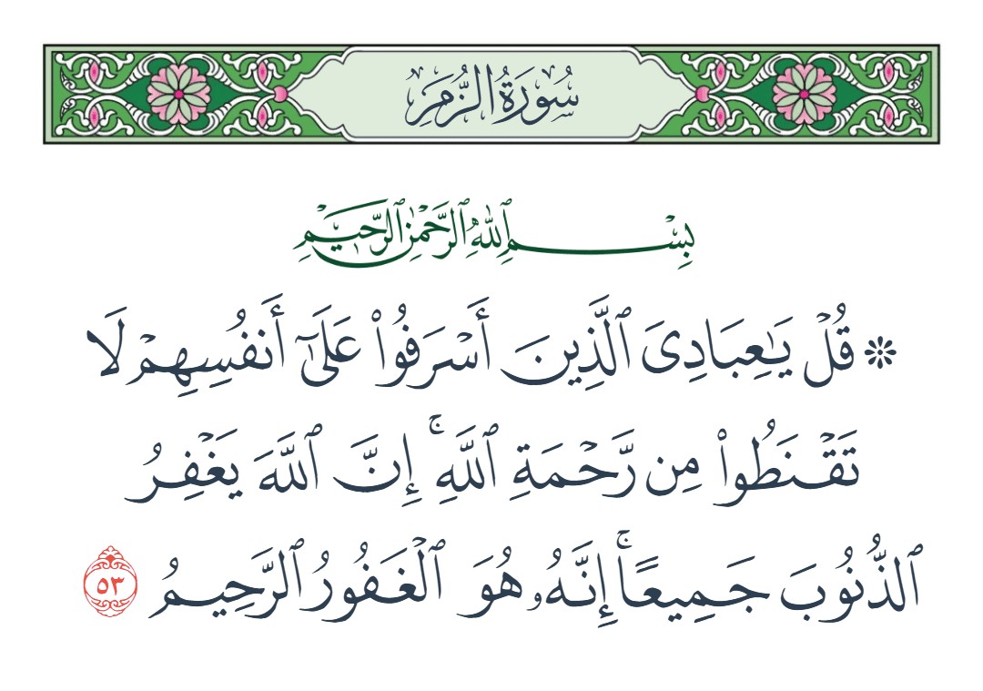 قل يا عبادي الذين أسرفوا على أنفسهم لا تقنطوا من رحمة الله إن الله يغفر الذنوب جميعا إنه هو الغفور الرحيم [الزمر : 53]
