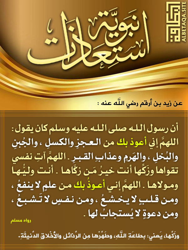 أن رسول الله صلى الله عليه وسلم كان يقول : اللهم إني أعوذ بك من العجز والكسل ، والجبن والبخل ، والهرم وعذاب القبر . اللهم آت نفسي تقواها. وزكها أنت خير من زكاها . أنت وليها ومولاها . اللهم إني أعوذ بك من علم لا ينفع ، ومن قلب لا يخشع ، ومن نفس لا تشبع ، ومن دعوة لا يستجاب لها .