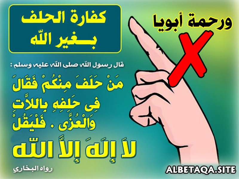 كفارة الحلف بغير الله لمشاهدة الصورة بحجمها الأصلي اضغط هنا تنزيل الصورة : ملف نصّي كفارة الحلف بغير الله قال رسول الله صلى الله عليه وسلم : من حلف منكم فقال في حلفه باللات والعزى . فليقل لا إله إلا الله رواه البخاري نسخ النص بالضغط على هذا الزر .. سيتم نسخ النص إلى الحافظة .. حيث يمكنك مشاركته من خلال استعمال الأمر ـ " لصق " ـ بطاقات الحدود والكفارات شارك :