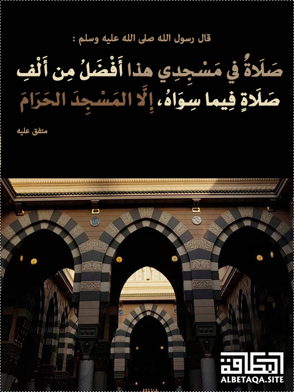 صلاة في مسجدي هذا لمشاهدة الصورة بحجمها الأصلي اضغط هنا تنزيل الصورة : ملف نصّي صلاة في مسجدي هذا قال رسول الله صلى الله عليه وسلم : صلاة في مسجدي هذا أفضل من ألف صلاة فيما سواه، إلا المسجد الحرام . رواه مسلم نسخ النص بالضغط على هذا الزر .. سيتم نسخ النص إلى الحافظة .. حيث يمكنك مشاركته من خلال استعمال الأمر ـ " لصق " ـ بطاقات متنوعة - المساجد وصلاة الجماعة شارك :