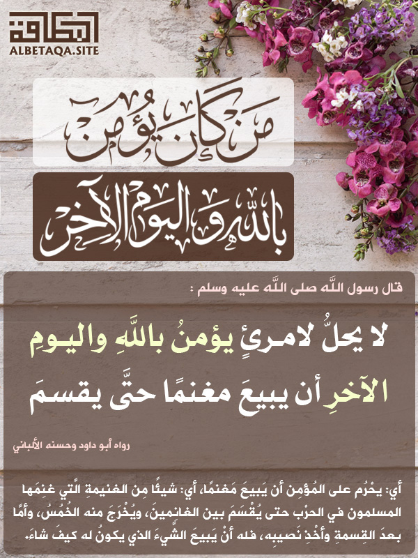 من كان يؤمن بالله واليوم الآخر – لا يحل لامرئ يؤمن بالله واليوم الآخر أن يبيع مغنما حتى يقسم