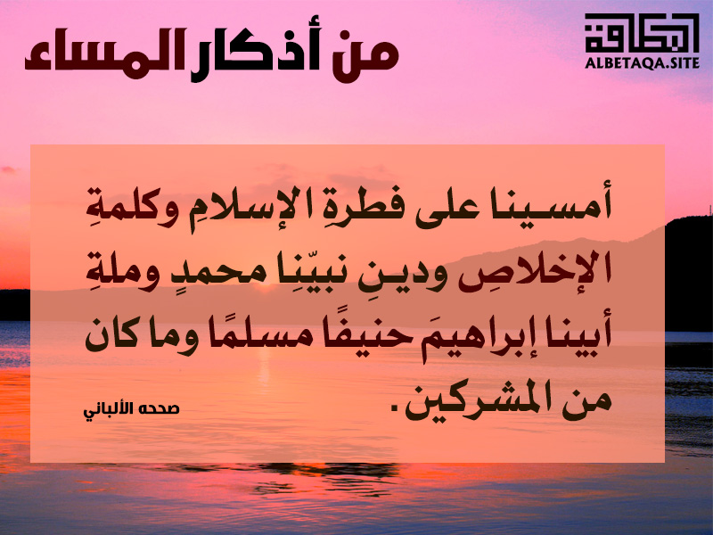 أمسينا على فطرة الإسلام وكلمة الإخلاص ودين نبينا محمد وملة أبينا إبراهيم حنيفا مسلما وما كان من المشركين