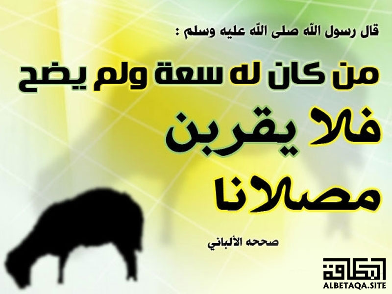 من كان له سعة ولم يضح لمشاهدة الصورة بحجمها الأصلي اضغط هنا تنزيل الصورة : ملف نصّي من كان له سعة ولم يضح قال رسول الله صلى الله عليه وسلم من كان له سعة ولم يضح فلا يقربن مصلانا صححه الألباني نسخ النص بالضغط على هذا الزر .. سيتم نسخ النص إلى الحافظة .. حيث يمكنك مشاركته من خلال استعمال الأمر ـ " لصق " ـ بطاقات الأضحية شارك :