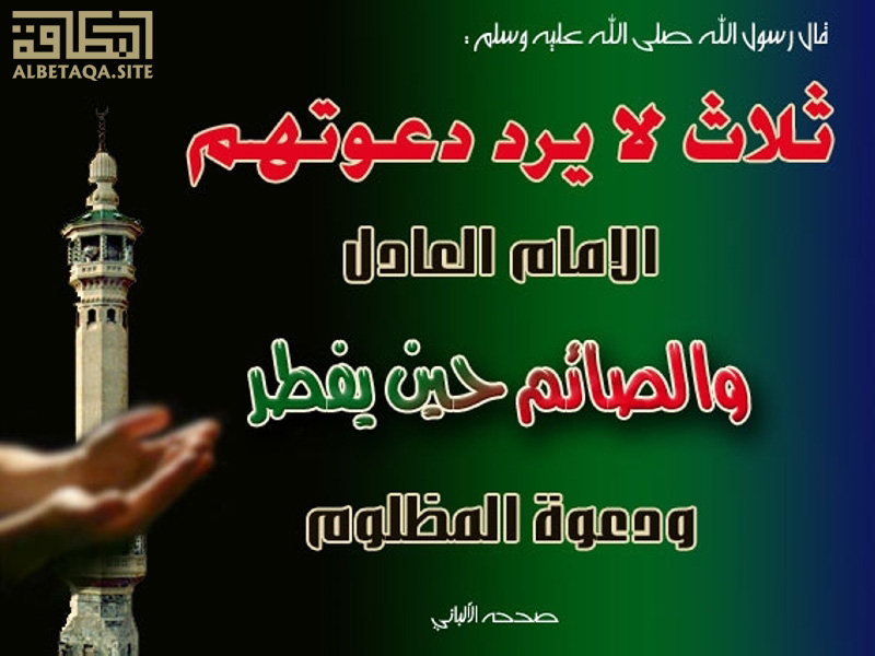 ثلاث لا يرد دعوتهم لمشاهدة الصورة بحجمها الأصلي اضغط هنا تنزيل الصورة : ملف نصّي ثلاث لا يرد دعوتهم قال رسول الله صلى الله عليه وسلم : ثلاث لا يرد دعوتهم الإمام العادل والصائم حين يفطر ودعوة المظلوم صححه الألباني نسخ النص بالضغط على هذا الزر .. سيتم نسخ النص إلى الحافظة .. حيث يمكنك مشاركته من خلال استعمال الأمر ـ " لصق " ـ بطاقات شهر رمضان المبارك شارك :