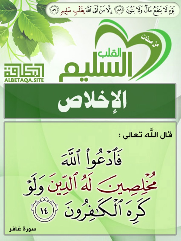 من صفات القلب السليم – الإخلاص لمشاهدة الصورة بحجمها الأصلي اضغط هنا تنزيل الصورة : ملف نصّي من صفات القلب السليم – الإخلاص قال الله تعالى فادعوا الله مخلصين له الدين ولو كره الكافرون [غافر : 14] نسخ النص بالضغط على هذا الزر .. سيتم نسخ النص إلى الحافظة .. حيث يمكنك مشاركته من خلال استعمال الأمر ـ " لصق " ـ سلسلة بطاقات القلب السليم شارك :