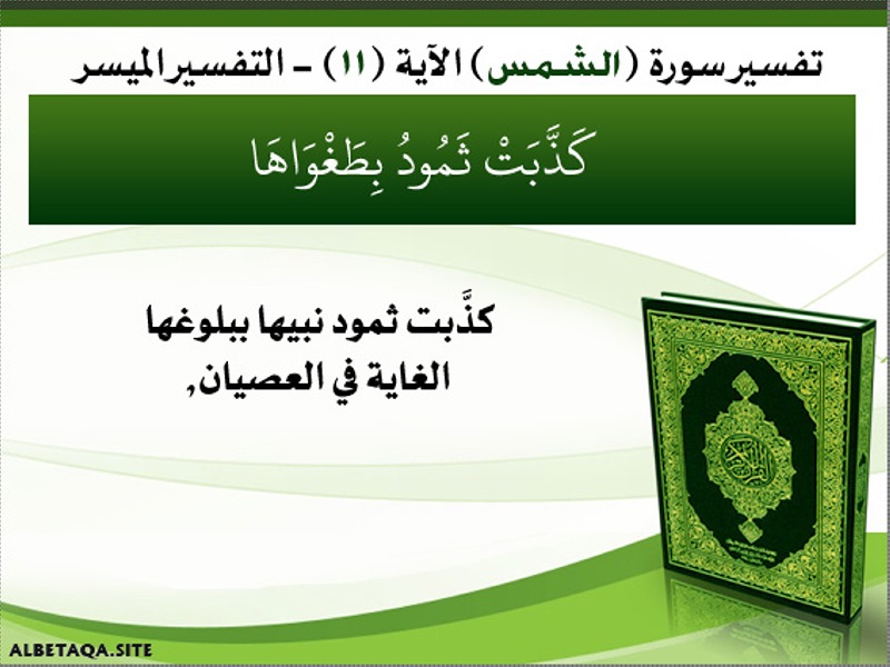 تفسير سورة ( الشمس ) الآية ( 11 ) – التفسير الميسر لمشاهدة الصورة بحجمها الأصلي اضغط هنا تنزيل الصورة : ملف نصّي تفسير سورة ( الشمس ) الآية ( 11 ) – التفسير الميسر كذبت ثمود بطغواها _ _ كذبت ثمود نبيها ببلوغها الغاية في العصيان , نسخ النص بالضغط على هذا الزر .. سيتم نسخ النص إلى الحافظة .. حيث يمكنك مشاركته من خلال استعمال الأمر ـ " لصق " ـ 091 سلسلة بطاقات تفسير سورة الشمس شارك :