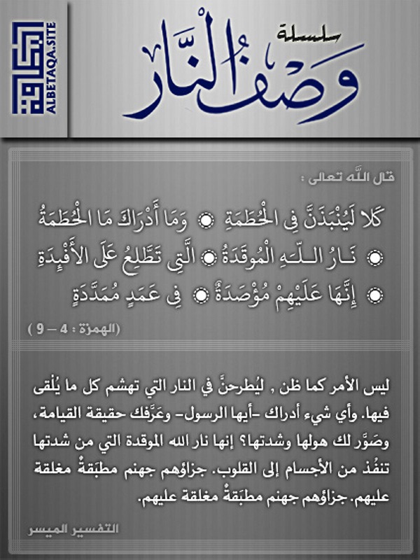كلا لينبذن في الحطمة ، وما أدراك ما الحطمة ، نار الله الموقدة ، التي تطلع على الأفئدة ، إنها عليهم مؤصدة ، في عمد ممددة