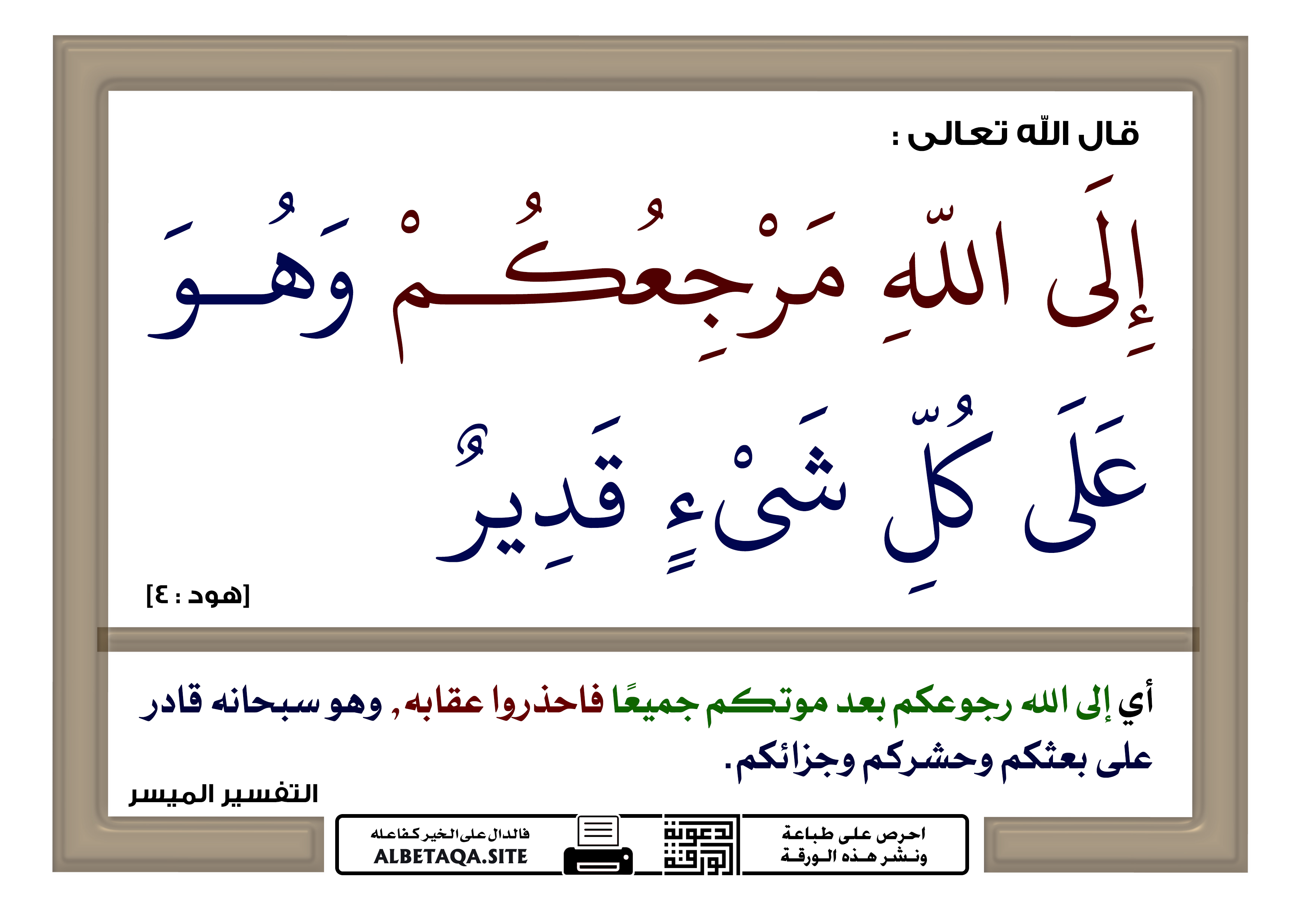 أي إلى الله رجوعكم بعد موتكم جميعا فاحذروا عقابه, وهو سبحانه قادر على بعثكم وحشركم وجزائكم.