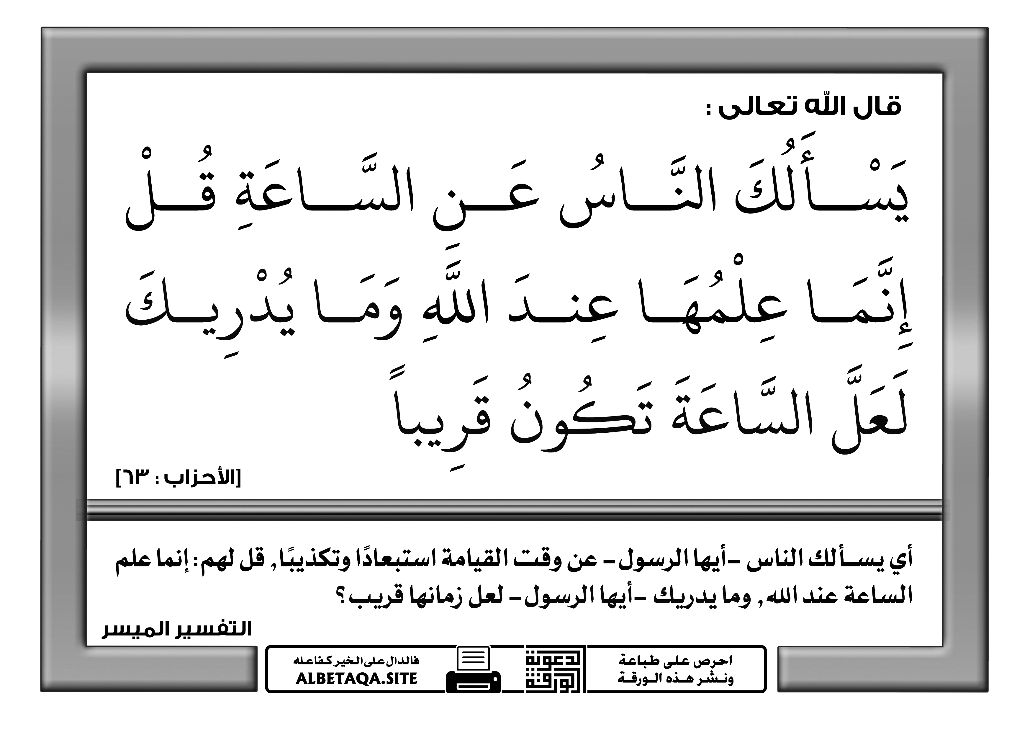 يسألك الناس عن الساعة قل إنما علمها عند الله وما يدريك لعل الساعة تكون قريبا