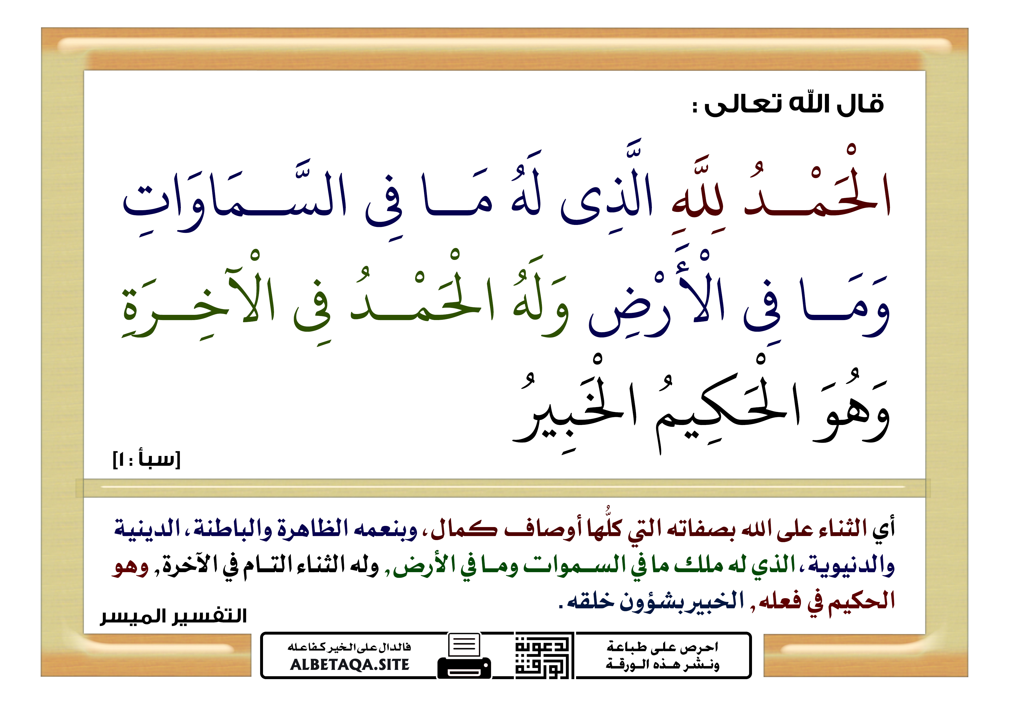 الحمد لله الذي له ما في السماوات وما في الأرض وله الحمد في الآخرة وهو الحكيم الخبير