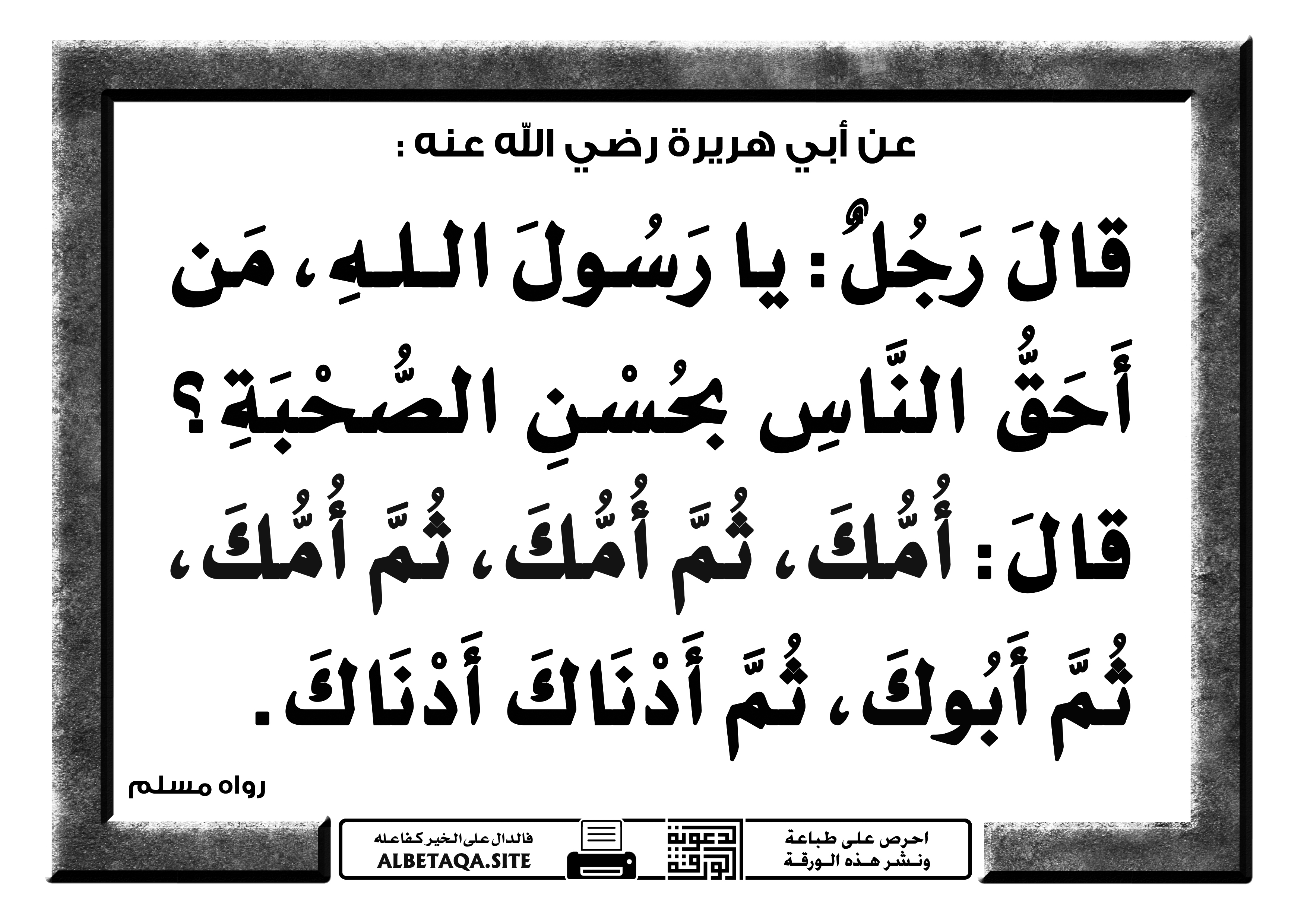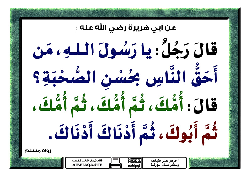قال رجل: يا رسول الله، من أحق الناس بحسن الصحبة؟ قال: أمك، ثم أمك، ثم أمك، ثم أبوك، ثم أدناك أدناك.