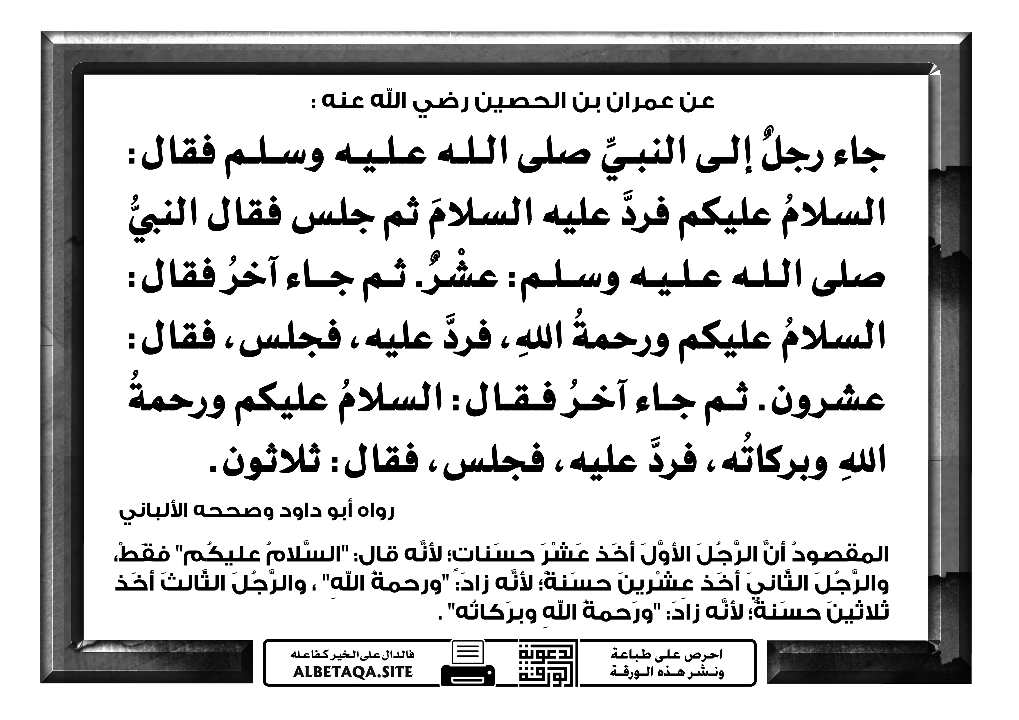 جاء رجل إلى النبي صلى الله عليه وسلم فقال: السلام عليكم فرد عليه السلام ثم جلس فقال النبي صلى الله عليه وسلم عشر. ثم جاء آخر فقال: السلام عليكم ورحمة الله، فرد عليه، فجلس، فقال: عشرون. ثم جاء آخر فقال: السلام عليكم ورحمة الله وبركاته، فرد عليه، فجلس، فقال: ثلاثون.