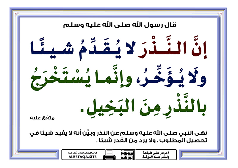 إن النذر لا يقدم شيئا ولا يؤخر، وإنما يستخرج بالنذر من البخيل.